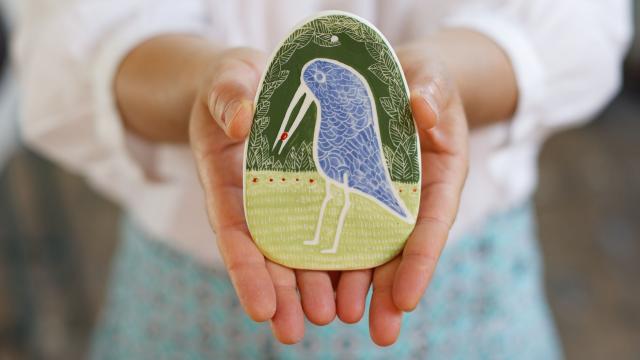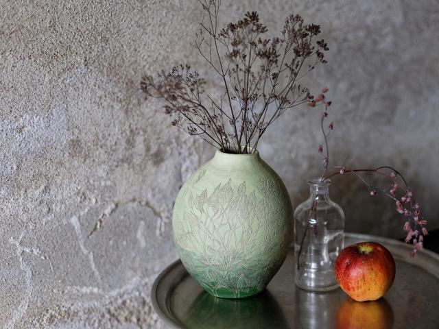 Avec la céramique, Anne sort de la feuille pour jouer avec le volume, l’espace, la sculpture. La porcelaine et le grès deviennent sous ses doigts des formes ventrues ou des viscères empilés comme des anneaux.