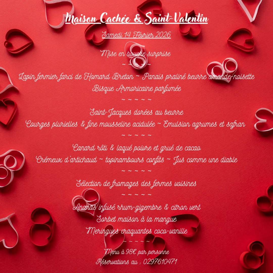 Sarah et Alban, du restaurant Maison Cachée, niché au cœur de Rochefort-en-Terre, ont le plaisir de vous présenter un menu élaboré avec soin pour célébrer la Saint-Valentin.