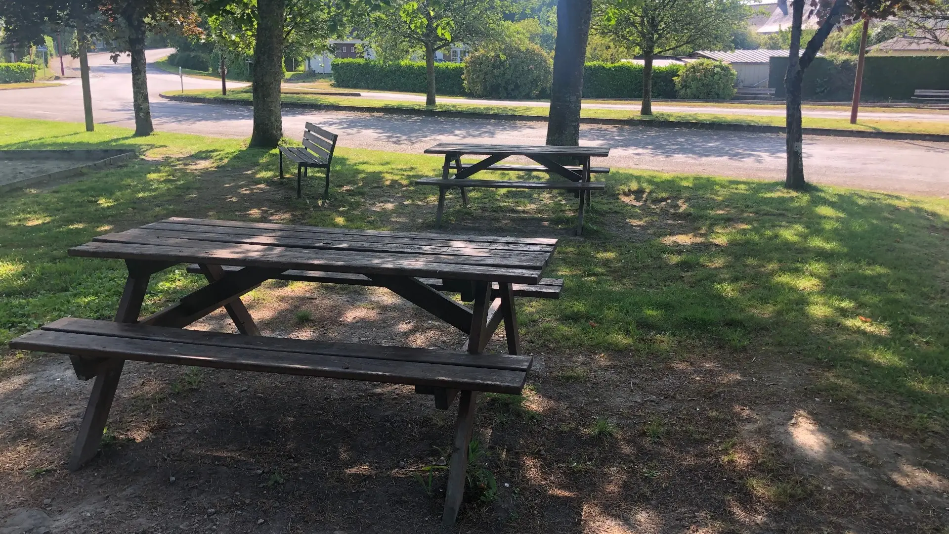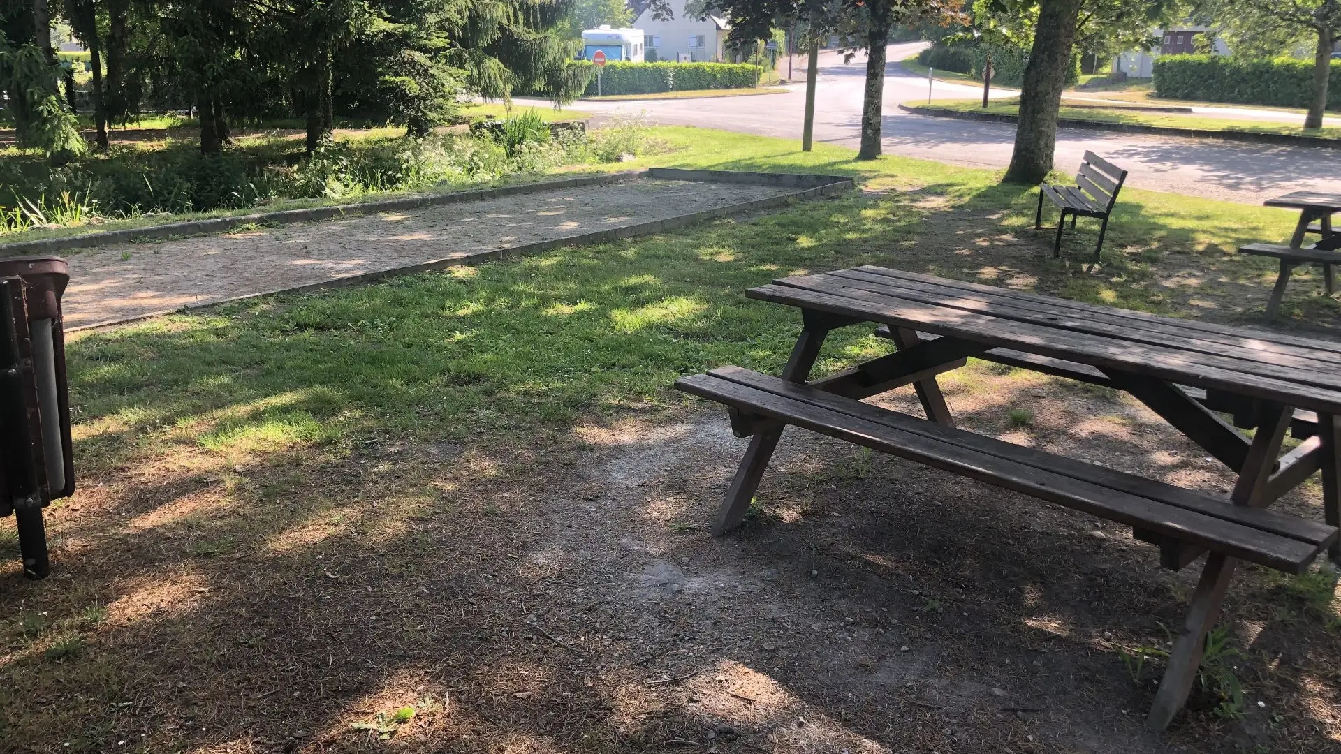 2 tables, poubelles - espace arboré - toilettes à 200 mètres, près de la Mairie - à côté d'un boulodrome et de l'aire de camping-car
