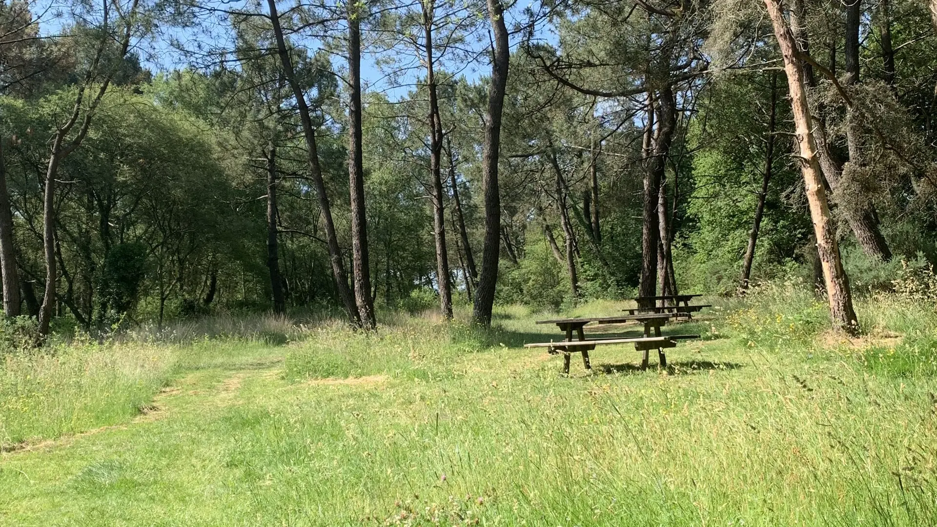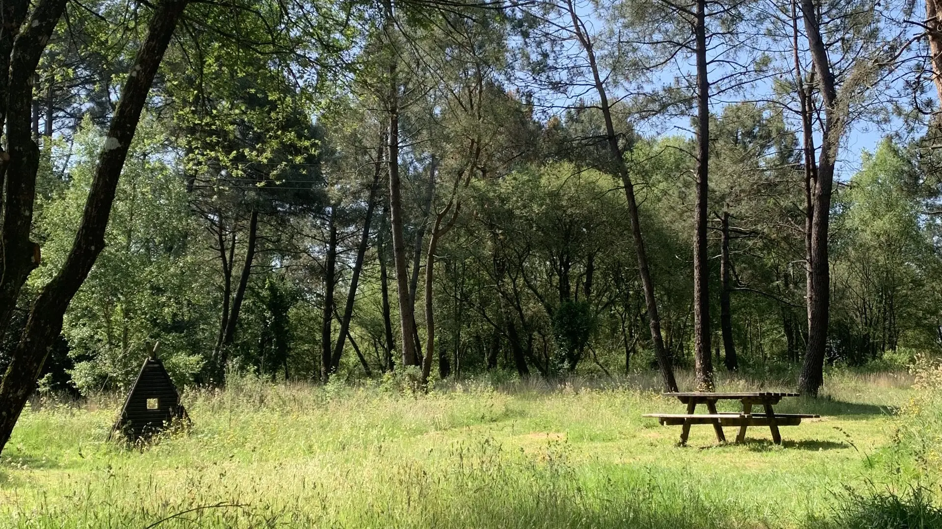 Une table, une poubelle - espace arboré / parcours santé / pas de toilettes - uniquement accessible à pied