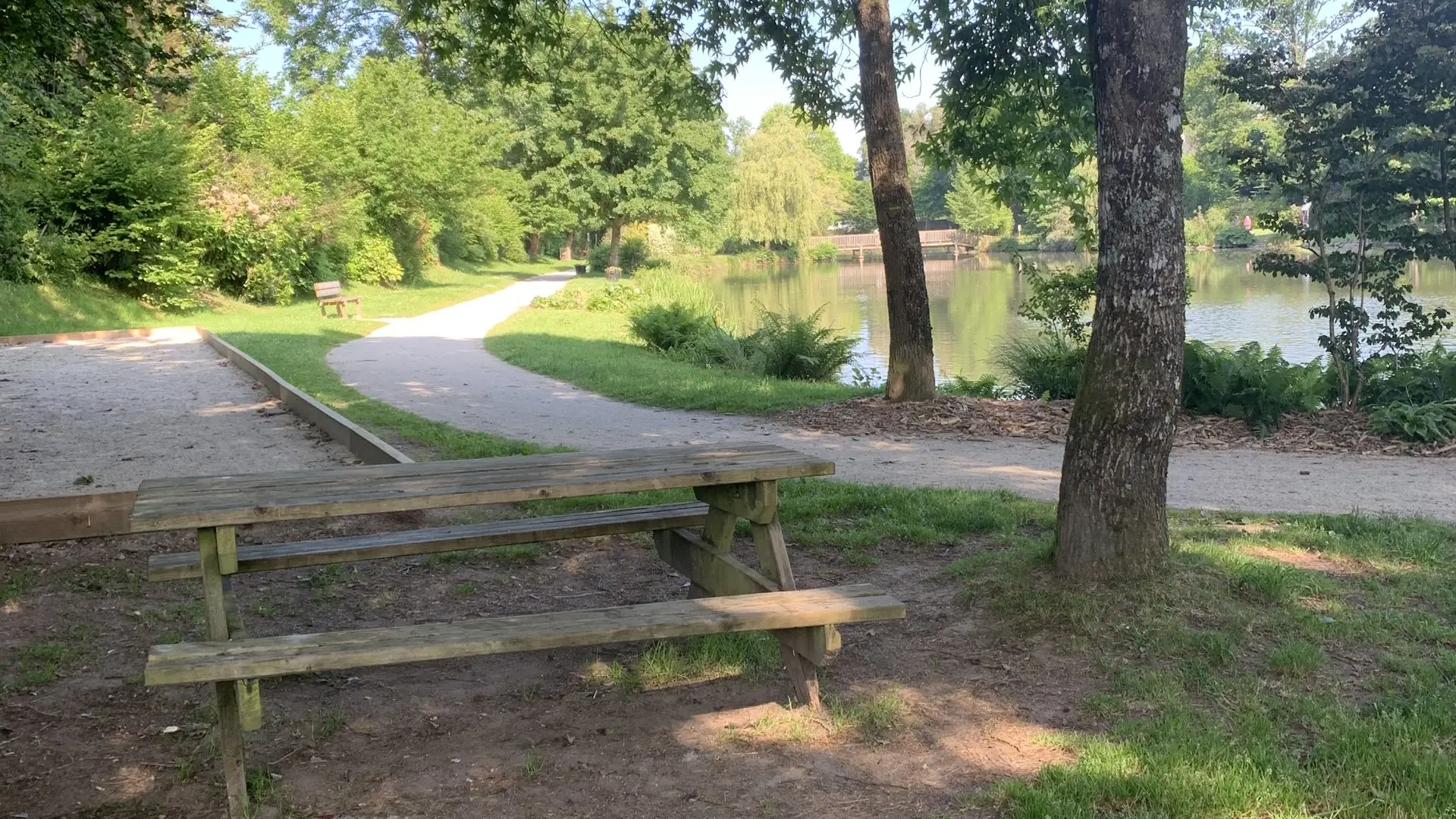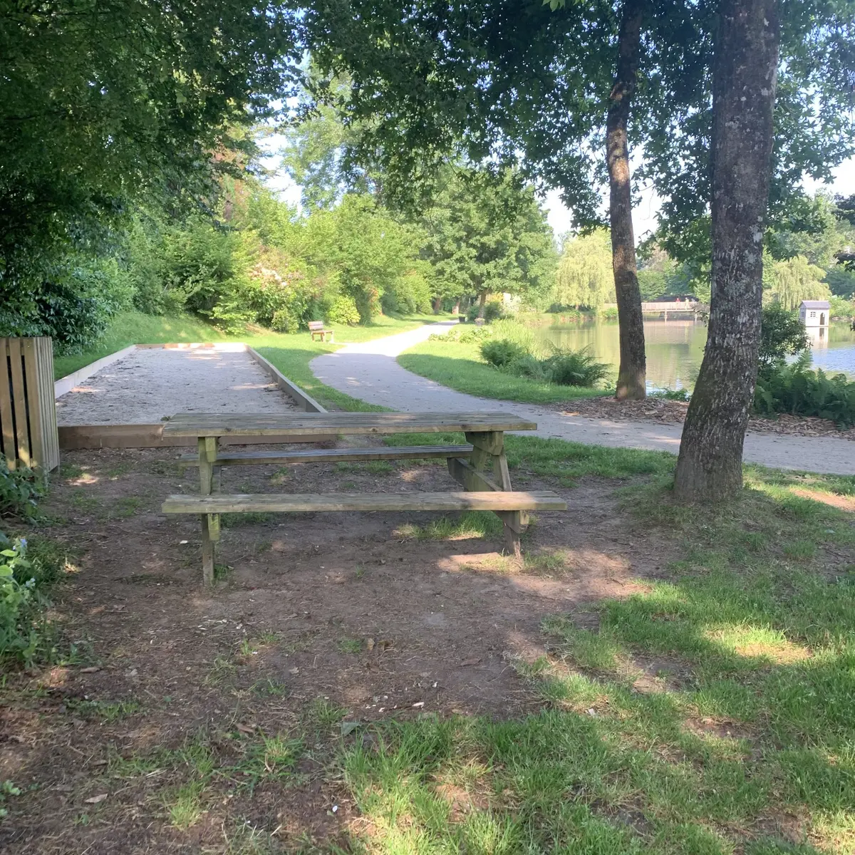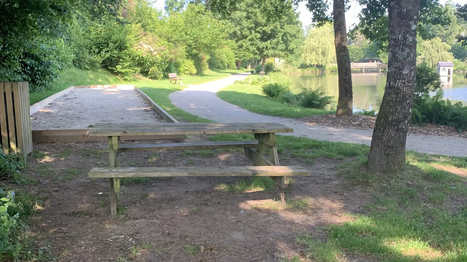 Une table, une poubelle - espace arboré - toilettes et parking près de l’Etang - jeux
