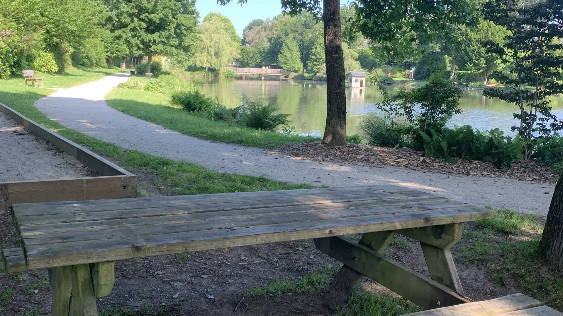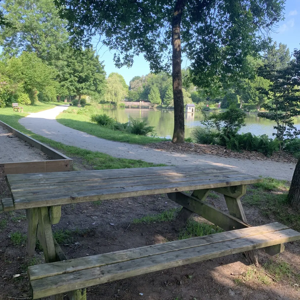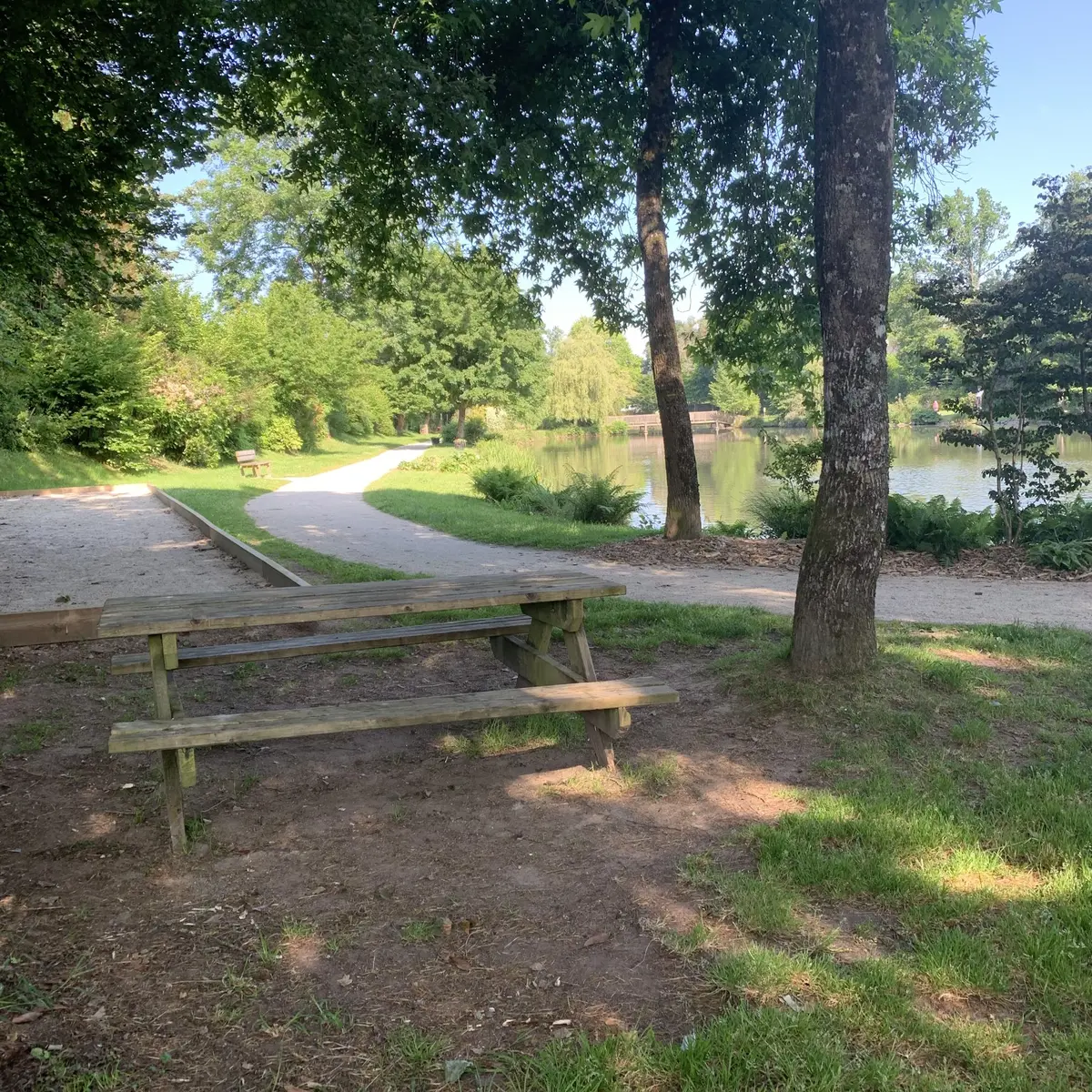 Une table, une poubelle - espace arboré - toilettes et parking près de l’Etang - jeux