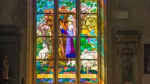 En entrant, on remarque l’inclinaison des colonnes. Ce phénomène est dû au fait que la Collégiale fut construite sans fondations, à même la roche : le schiste. Par ce manque de fondation, la Collégiale s’était mise à suivre le mouvement du sol ; elle glissait vers le Sud! Pour stopper ce mouvement, la construction du bas-coté sud à été réalisé : cette construction sert de contrefort. Suite à cette construction, la collégiale s’est effectivement arrêtée de glisser, mais elle s’est mise à pivoter vers l’Ouest! De nouveau il a fallu ajouter un contrefort à l’Ouest du monument. Ces mouvements, et les modifications qui ont suivi, se sont fait au fur et à mesure des siècles, et donc des styles architecturaux. La Collégiale est un mélange de style Roman (clocher), de Gothique (façade Nord) et de Renaissance. A droite du chœur se trouve un magnifique vitrail, commandé en 1927 à un verrier d’Angers : Mr Roger Desjardin. Ce vitrail raconte la légende de la bergère trouvant la statue dans le tronc d’arbre creux.