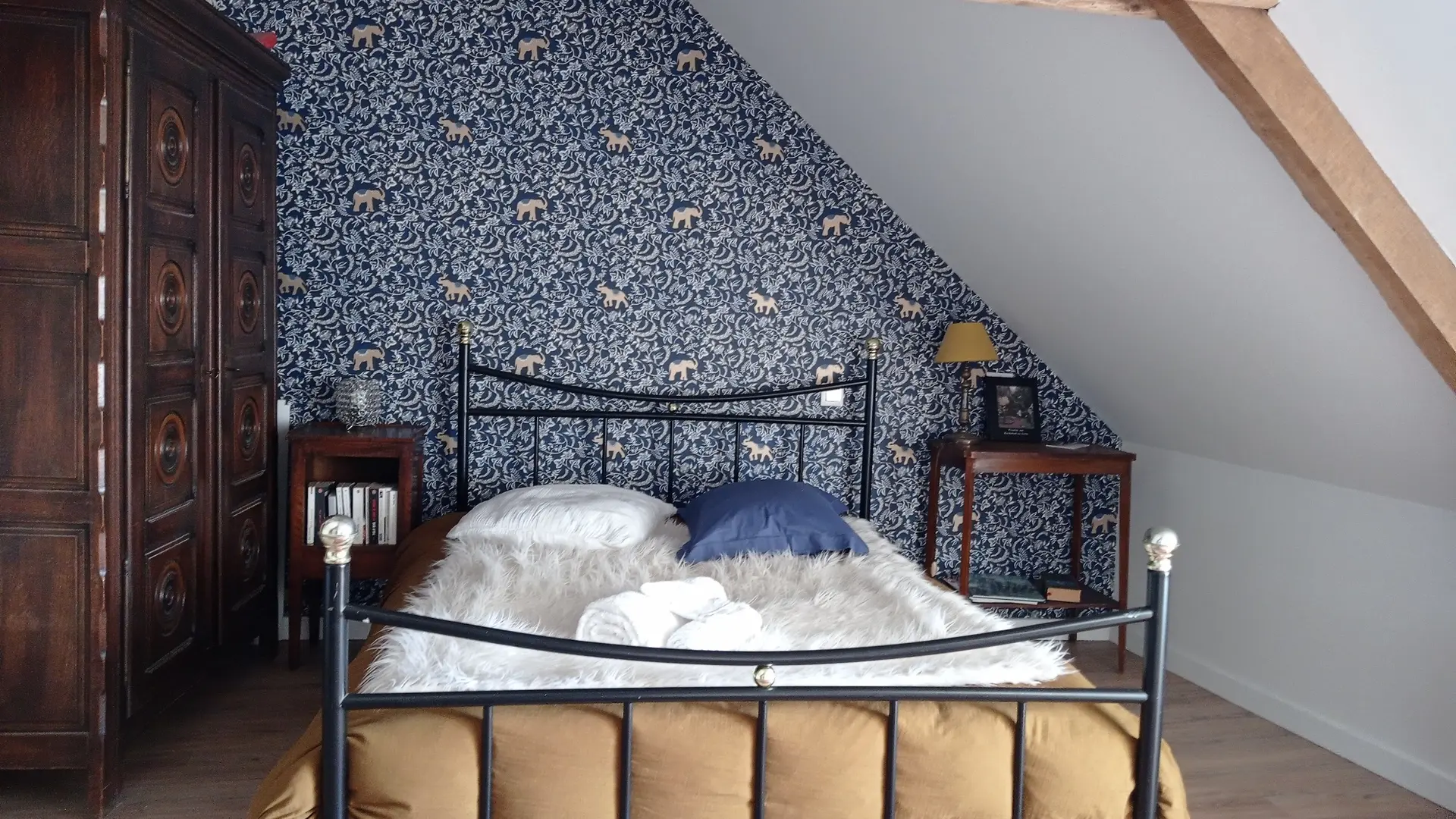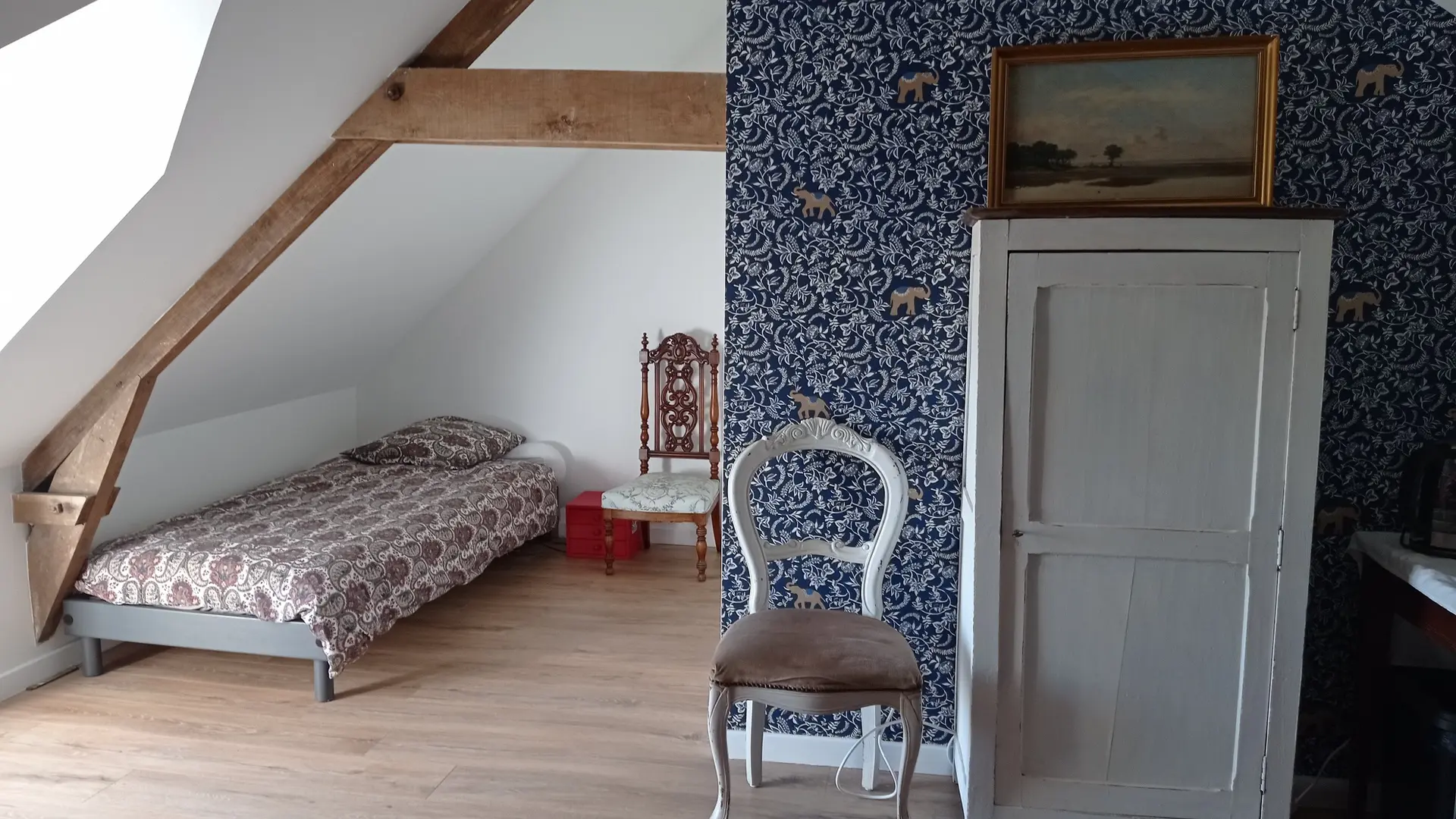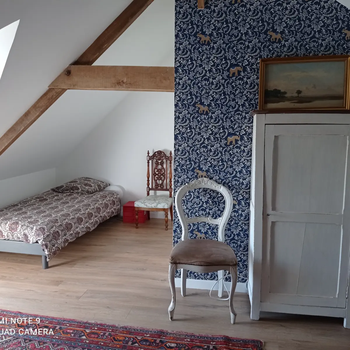 Cette chambre sous pente au 2° étage de ma maison, située en plein cœur du village de Rochefort-en-terre, au pied du château, est meublée d'un lit double et d'un lit simple.