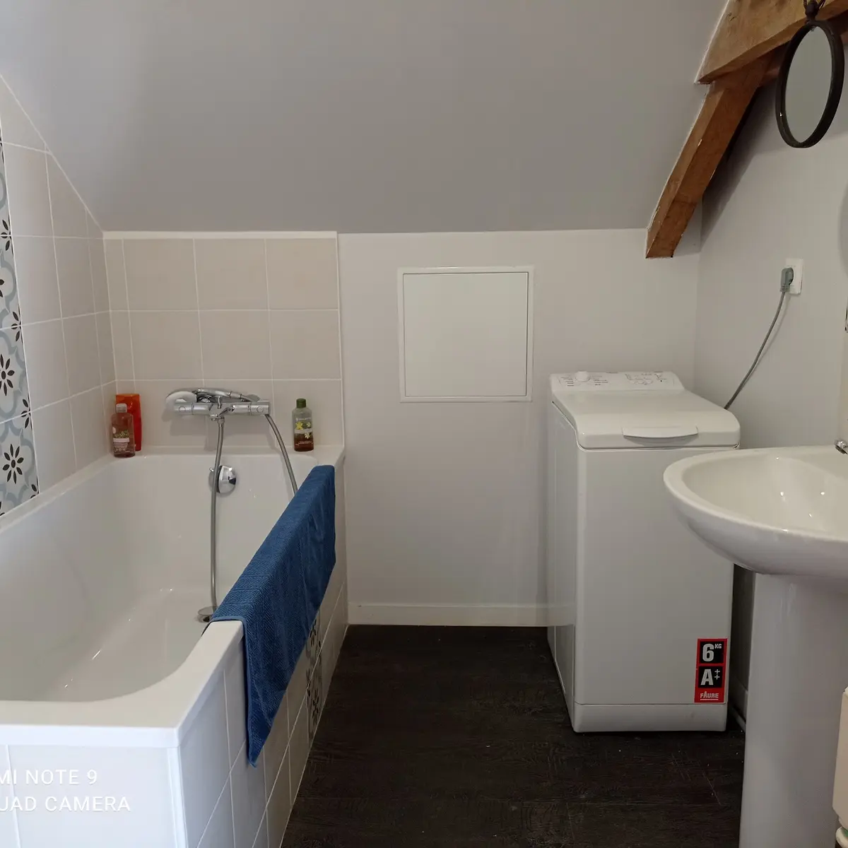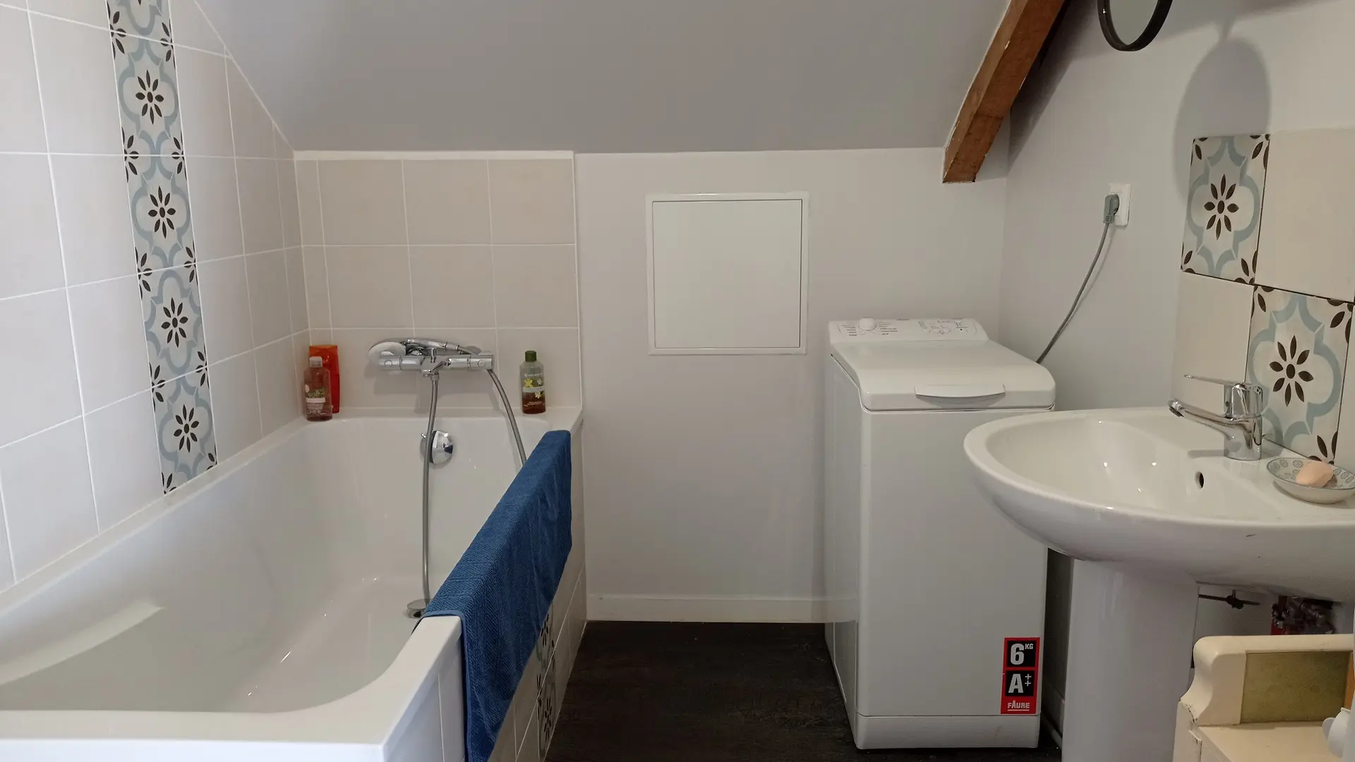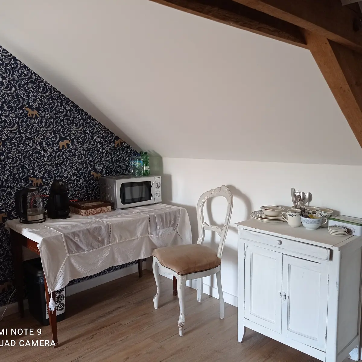 Cette chambre sous pente au 2° étage de ma maison, située en plein cœur du village de Rochefort-en-terre, au pied du château, est meublée d'un lit double et d'un lit simple.