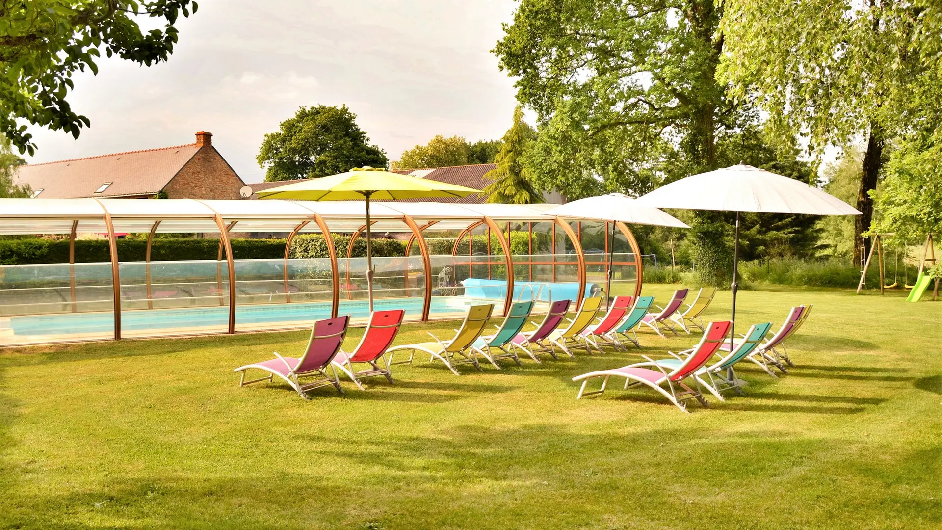 Le grand jardin arboré et fleuri avec trampoline, entièrement clôturé, mène à la piscine couverte et chauffée de 12mx6m et à la salle de jeux (billard, baby-foot, ping-pong, fléchettes...).