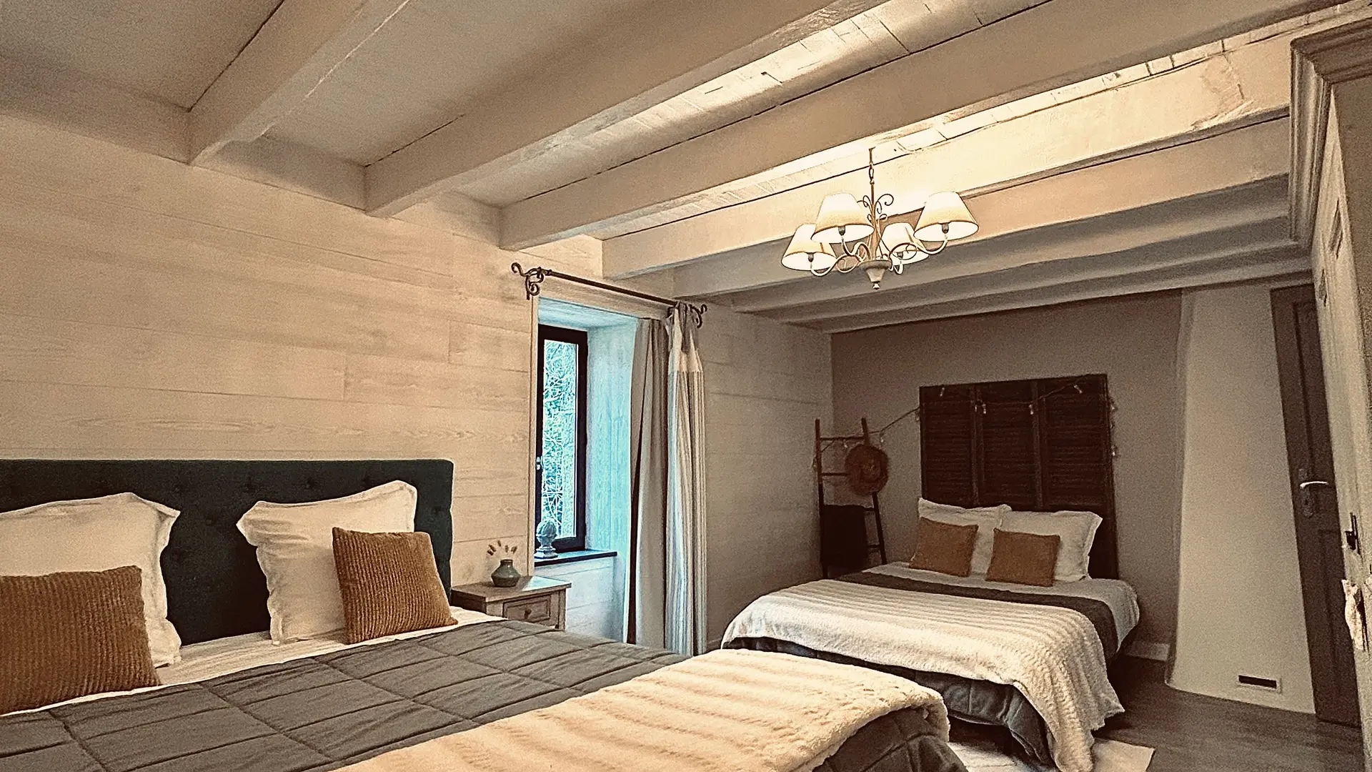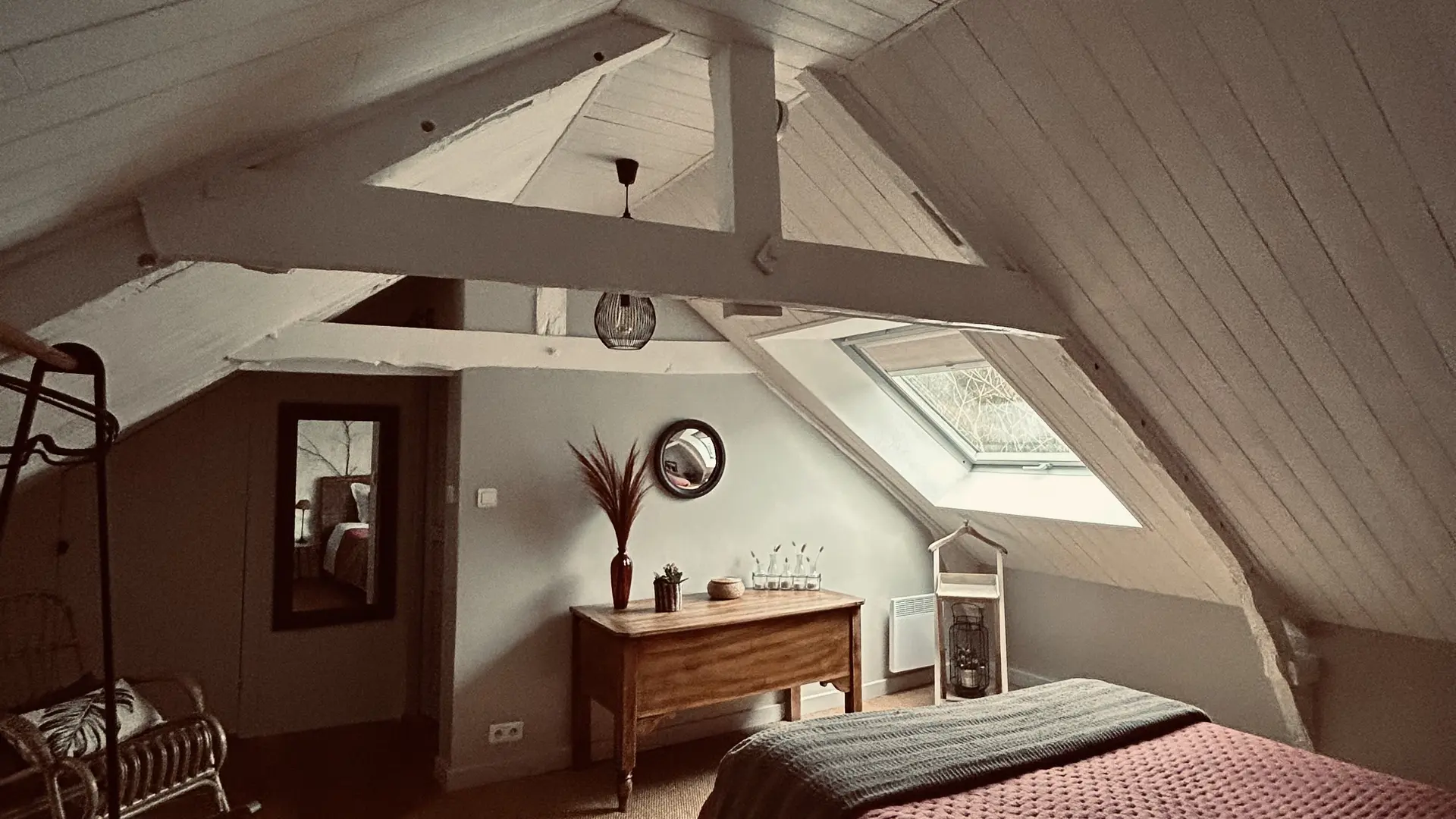Une suite parentale avec SdE privative est aménagée sous les toits. Le 1er étage offre une grande chambre avec 4 couchages modulables et une SdB (baignoire et douche). Au pied de l'escalier, vous trouverez un salon orné d'une cheminée du 16ème siècle, des toilettes et une salle cathédrale qui accueille la cuisine et la salle-à-manger.