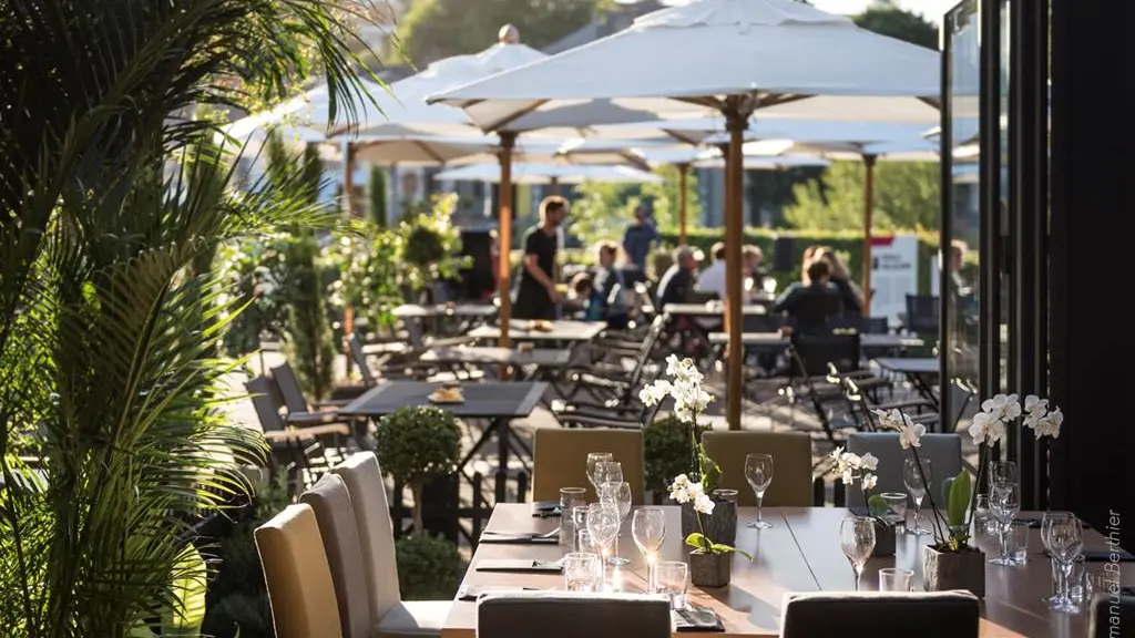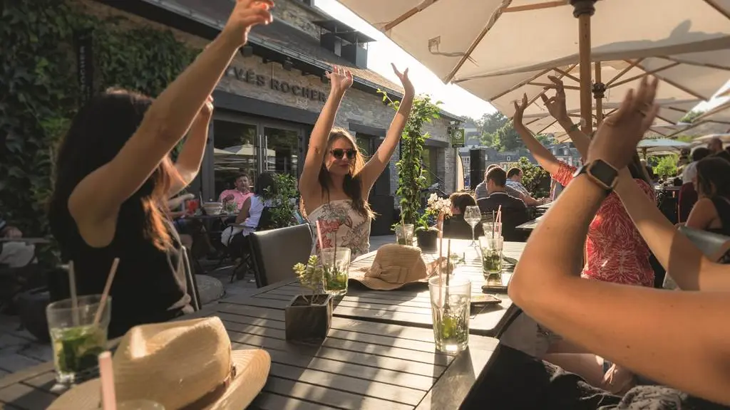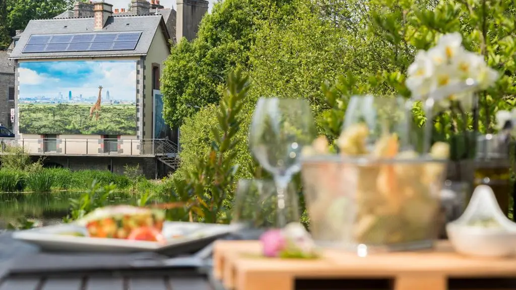 Au cœur du village de la Gacilly, se niche une lumineuse terrasse en bois jouxtant le moulin en pierre de la Maison Yves Rocher.