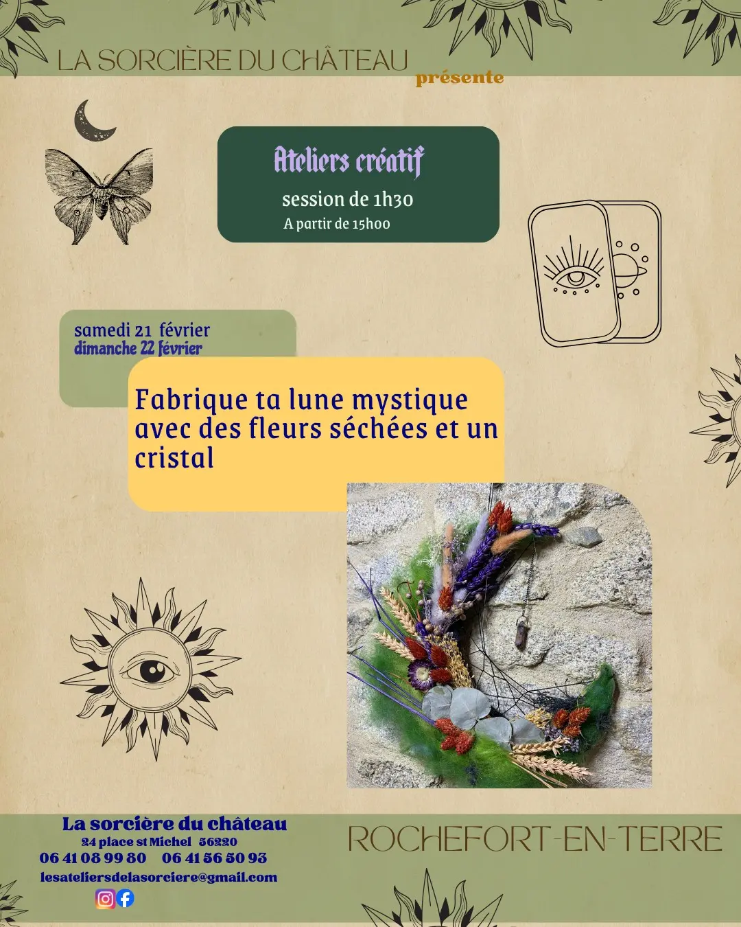 Atelier créatif dans la détente et la bonne humeur pour créer une décoration en forme de lune avec des fleurs séchées et un cristal. La Sorcière du château célèbre Imbolc, de tradition gaélique, à mi-chemin entre le solstice d'hiver et l'équinoxe de printemps.