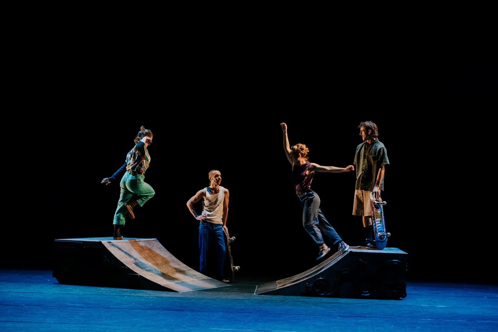 Pour Fiskal (impeccab’ en breton), la compagnie C’hoari s’inspire des valeurs fondatrices du skate et de la culture traditionnelle bretonne. En détournant les codes à l’origine de ces pratiques, le quatuor (deux skateurs et deux danseuses) évolue avec une scénographie à l’allure rétro, et sous le tintement de créations sonores à contre-courant de la modernité. Comme un vent de résistance joyeuse et créative pour questionner ensemble la transmission, l’authenticité et le faire en collectif !