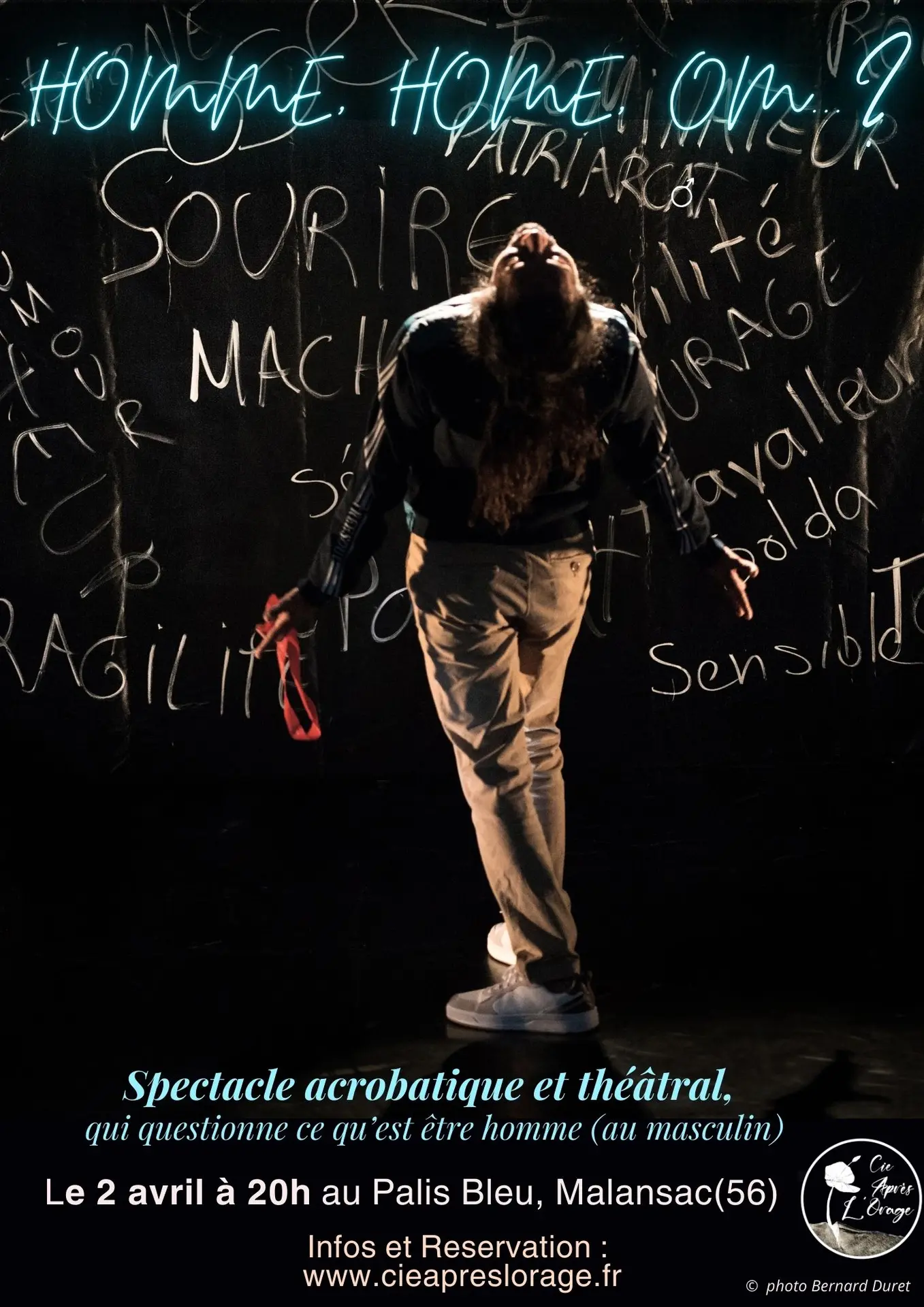 Spectacle acrobatique et théâtral par la Compagnie Après l'orage, qui questionne sur ce qu'est être homme (au masculin).