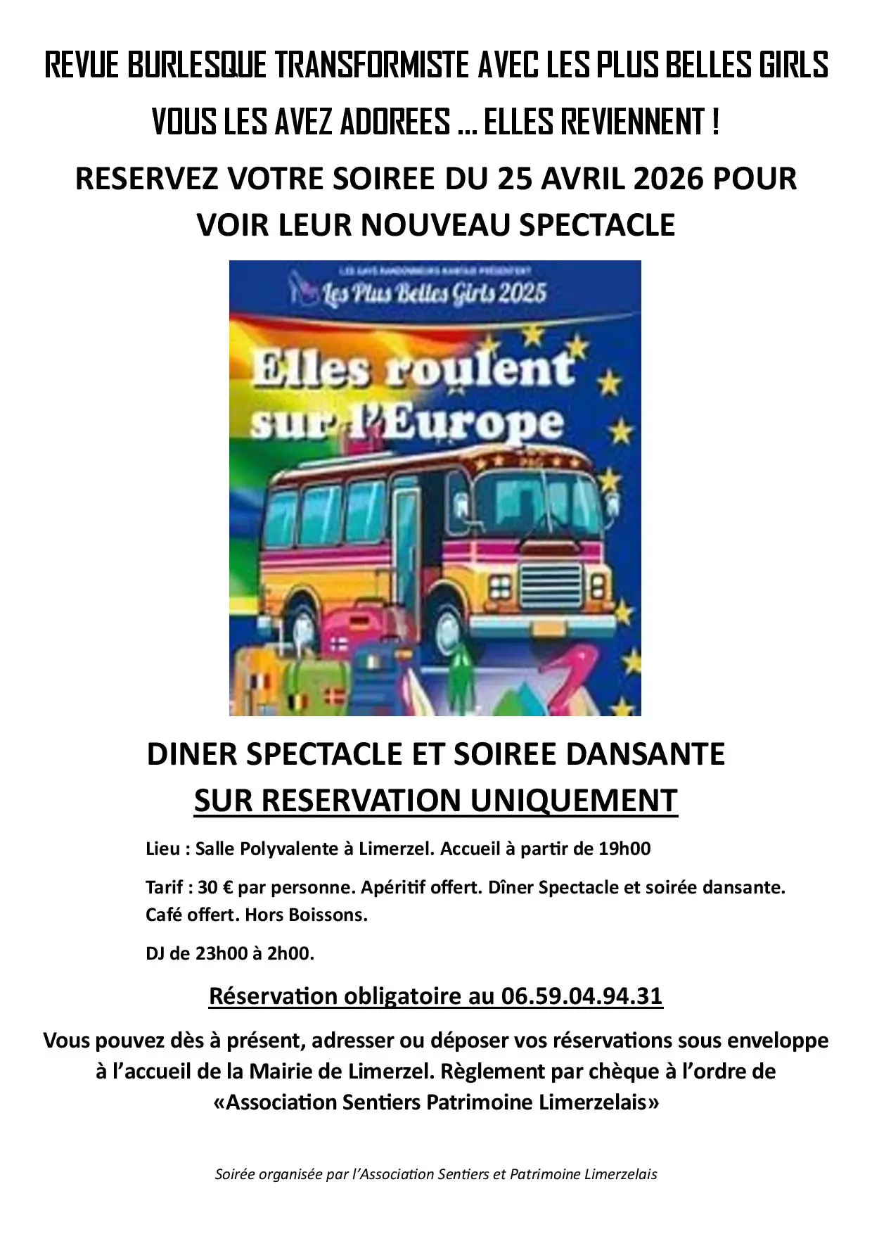 L’Association Sentiers et Patrimoine Limerzelais, organise une Soirée spectacle « Revue Burlesque Transformiste » avec dîner et soirée dansante.