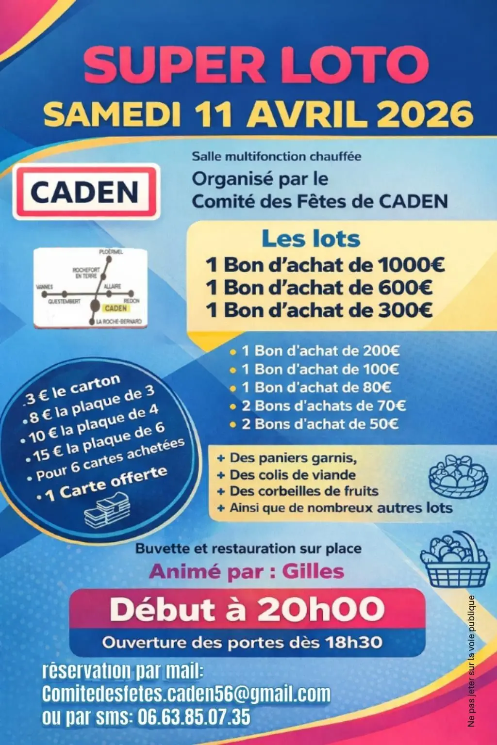 Super Loto animé par Gilles. Bons d'achat, paniers garnis et de multiples autres lots. Salle chauffée. Buvette et restauration sur place. Ouverture des portes dès 18h30.